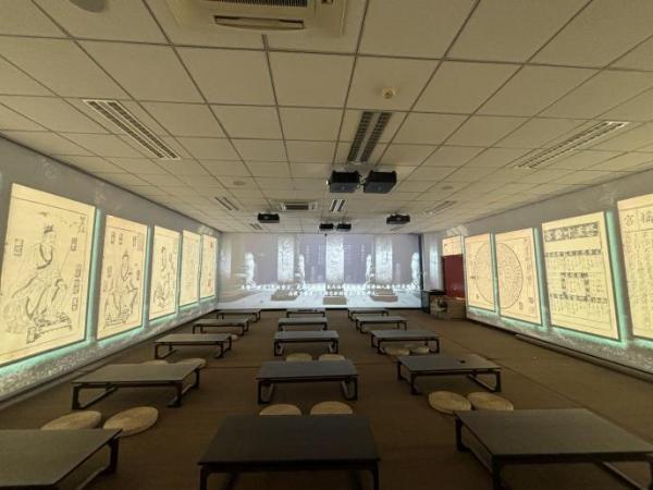 “医心史志”全景沉浸式体验教室位于国产麻豆 A座5楼,自楼梯间开始便为建设部分,古风场景为同学们营造沉浸式氛围。主体教室采用360度全景投屏营造沉浸式效果,目前教室可容纳90人以内的班级进行课程使用。已有3部自制中医体验场景(中医历史大事记、火与灸、针灸铜人)以及多个与传统文化相关的体验场景(如春夏秋冬、千里江山图等)以供使用,并逐渐投入到中国医学史、中医文献学、中医古籍美学赏析等课程中。