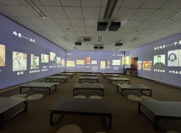 项目利用最受欢迎的方式,传授最传统的知识,打造“最难忘的课”。教室内设置360度全景投屏,融入多个静态或微动态特定教学场景,利用数字语音、全景影像、三维影像等技术进行互动性教学,不仅适用于现有教学资源的要求,且可在特定教学场景中改革教学方式、创新教学内容。同时学科在体验教室对面提供数百部珍藏图书以配合教学,为学生提供了一个沉浸式学习的环境。