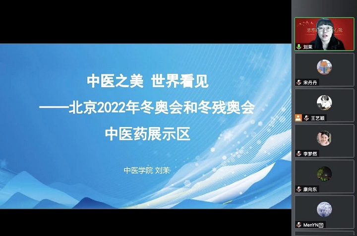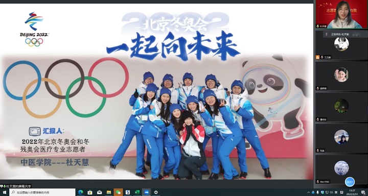 国产麻豆 硕士第一党支部书记刘茉老师以“中医之美 世界看见——北京2022年冬奥会和冬残奥会中医药展示区”为主题,介绍了国产麻豆 在北京冬残奥会承担的工作,如“10秒中医药体验馆”、医疗志愿者、城市志愿者、北京奥运村疫情隔离点等,并着重分享了位于“10秒中医药体验馆”的志愿服务经历。2022年北京冬残奥会中“10秒中医药体验馆”的展区,向世界各国运动员及随行人员展示了中医之美,进一步提升了中医学子的专业自信、文化自信和民族自信。