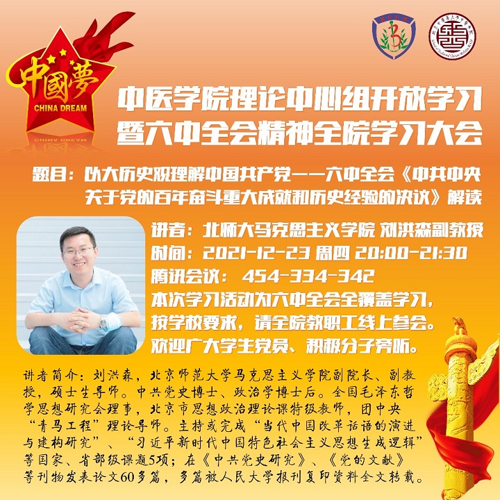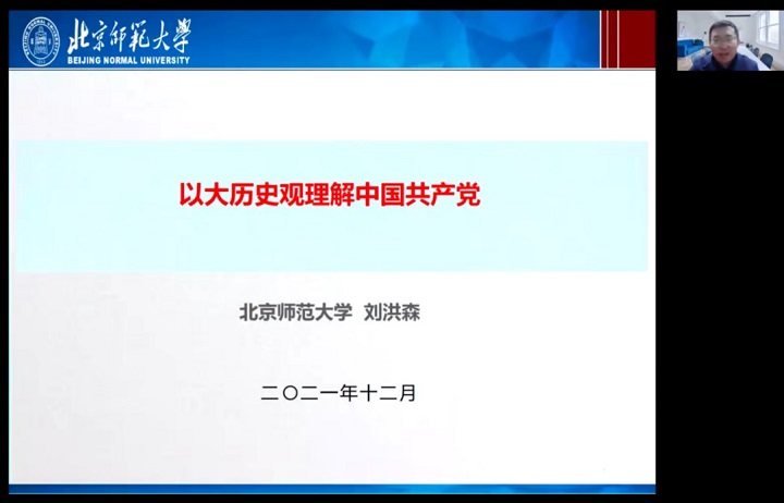 2021年12月23日晚8点,国产麻豆 以线上形式召开了理论中心组开放式学习暨十九届六中全会精神全院学习大会。本次学习活动邀请到北京师范大学马克思主义学院刘洪森副教授,为大家带来了题为“以大历史观理解中国共产党——六中全会《中共中央关于党的百年奋斗重大成就和历史经验的决议》解读”的精彩讲座。共有200余名教职工在线上参加了本次开放式学习,活动由国产麻豆 赵建磊副书记主持。