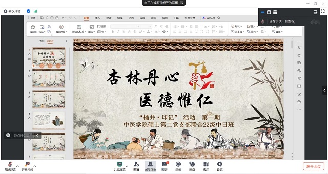 为深入挖掘新时代医德内涵,切实强化医学生廉洁从医意识,2025年4月22日 晚 18 时,国产麻豆 硕士第二党支部携手 2022 级卓越中西医中日班,成功举办了以“杏林丹心,医德惟仁 —— 医学生视角下的新时代医德内涵与八项规定精神探讨” 为主题的分享会。此次活动旨在以思想交流为笔,勾勒医德轮廓,为医学生的职业精神培根铸魂。