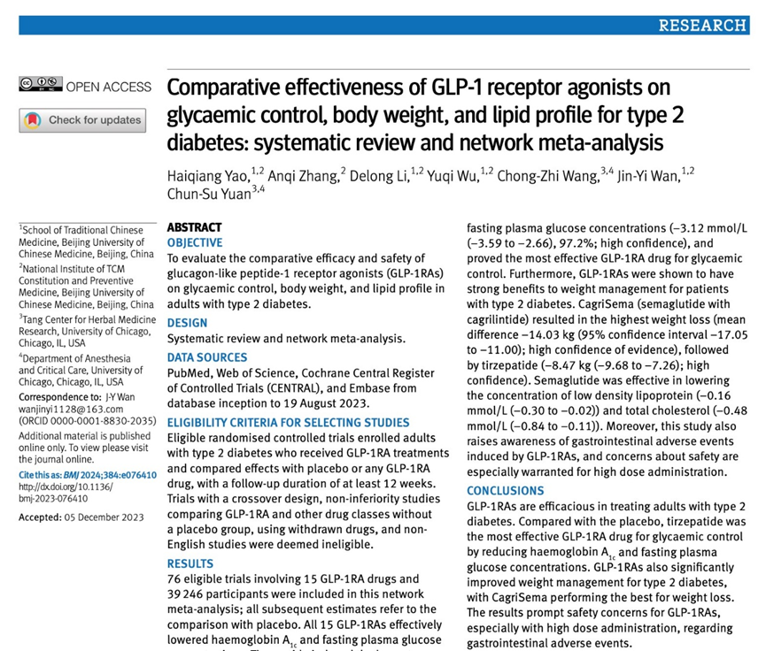 近日,国产麻豆 万瑾毅副研究员、姚海强副研究员带领团队,与芝加哥大学Chun-Su Yuan终身讲席教授团队合作,针对GLP-1RA药物对2型糖尿病患者血糖水平、体重控制、血脂情况以及用药安全性等多方面作用开展了系统而详尽的评价研究。相关研究成果以“Comparative effectiveness of GLP-1 receptor agonists on glycemic control, body weight, and lipid profile for type 2 diabetes: systematic review and network meta-analysis”为题发表于顶级医学期刊英国医学杂志(BMJ-British Medical Journal,IF 107.7)。