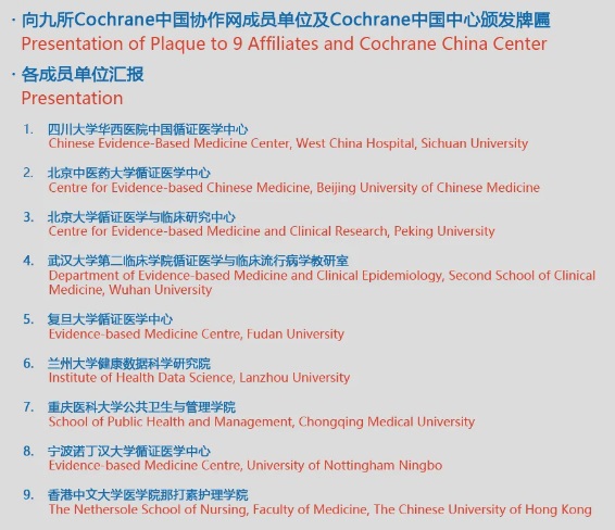 此外,Cochrane理事会联席主席Tracey Howe教授、Cochrane Library期刊Karla Soares Weiser主编、Cochrane美国协作网联合主席Dru Riddle教授、Cochrane知识转化部门Jo Anthony部长和Cochrane人力服务部门Chris Champion部长分别就Cochrane应对全球积极老龄化、COVID-19、证据改变临床实践和知识转化等前沿领域进行了专题分享交流。同时,来自其他8家成员单位共29位专家和学者就新冠大流行、指南的制定和实施、快速指南/推荐、数据共享和证据综合等主题进行报告和分享,精彩纷呈。