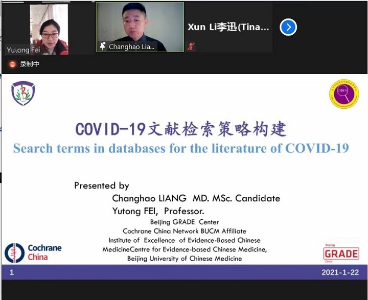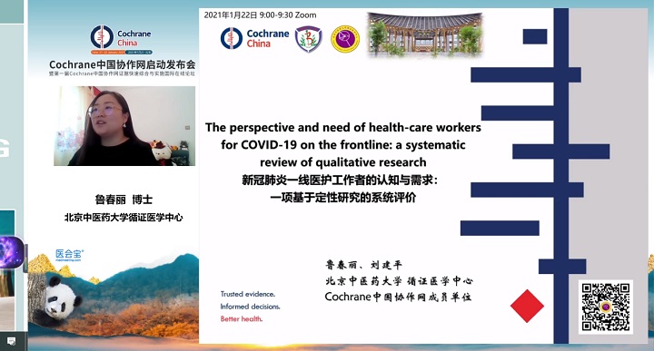 会上,国产麻豆 循证医学中心主任、国际中医药循证研究院执行院长刘建平教授代表对国产麻豆 循证医学中心进行介绍,并担任COVID-19专场的主持人。简体中文翻译传播负责人李迅老师对循证医学中心目前承担的Cochrane简体中文翻译传播工作进行介绍,博士研究生鲁春丽同学(刘建平教授指导)就COVID-19一线医护人员的认知与需求的定性研究系统评价研究进行分享,硕士研究生梁昌昊同学(费宇彤教授指导)就COID-19的检索策略研究进行展示。