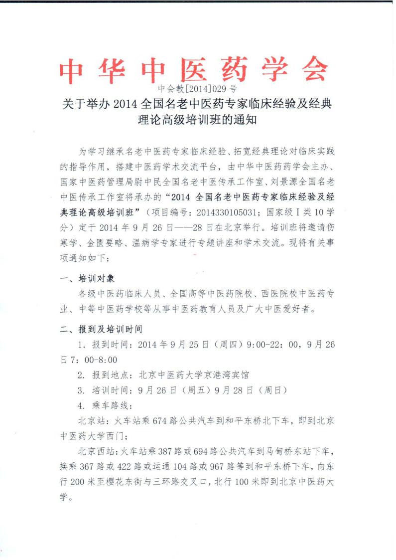 关于举办2014全国名老中医药专家临床经验及经典理论高级培训班的通知