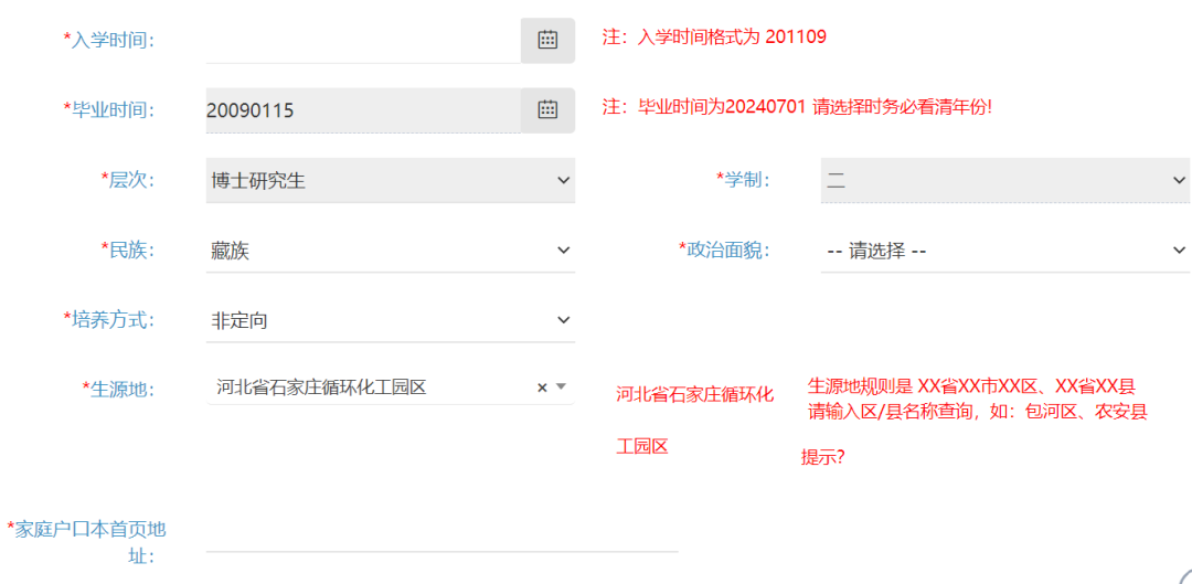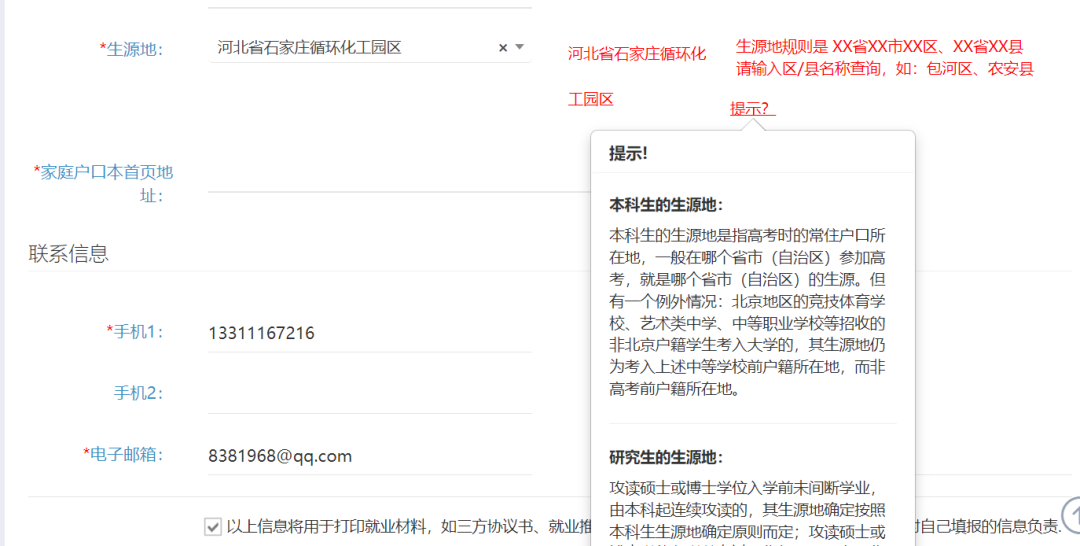 此外,在核对生源地一项时,在其后有“提示?”,将鼠标移动到字体会有对话框显示,同学也可以参照上面的要求进行核对