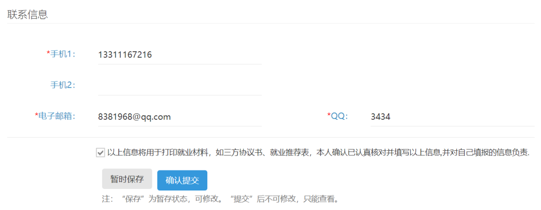 核对个人基本信息时,如发现有错误,可自行输入修正。部分信息学生本人不可修改,如“学院”、“专业”、“毕业时间”等。如遇到不可修改的信息有误,请联系学院负责就业的老师进行修正。核对信息后并确保自己信息无误,请一定要点击“确认提交”按钮(基本信息如果有误会将影响毕业手续的办理,一定要仔细核对自己的信息)