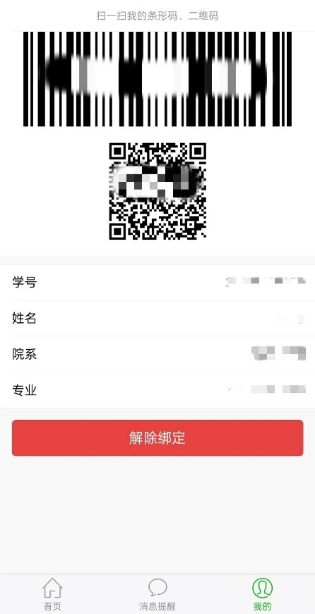 在绑定学号成功后,系统会自动生成一个二维码,上面包括学生的学号、姓名、院系、专业的信息