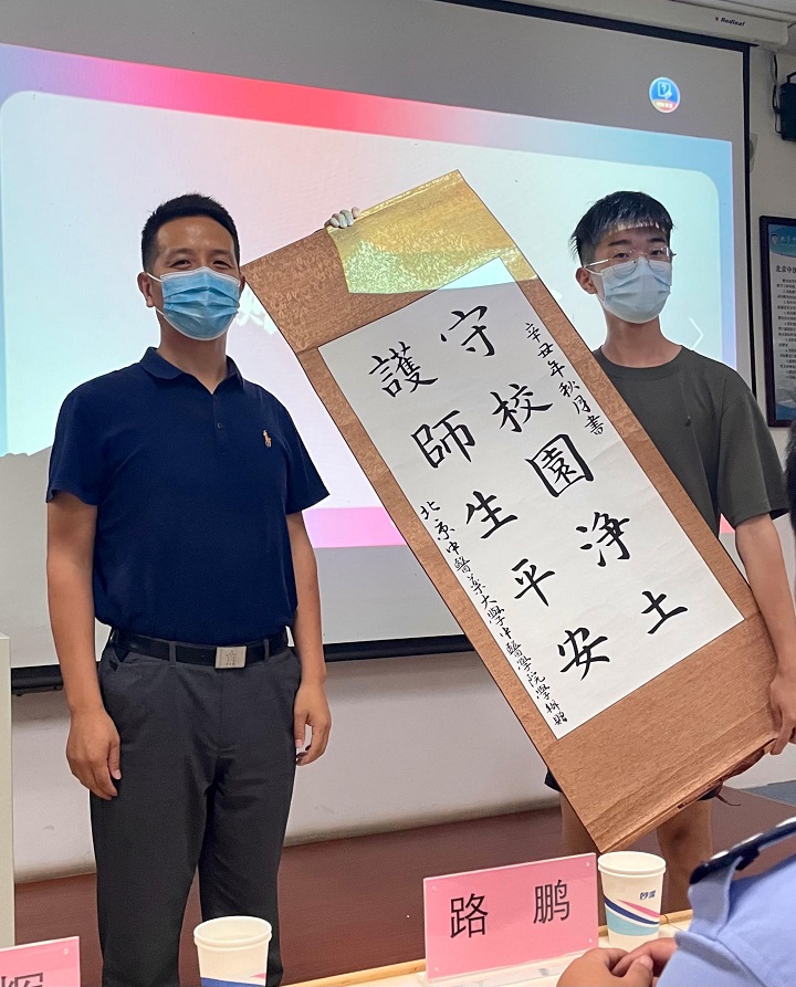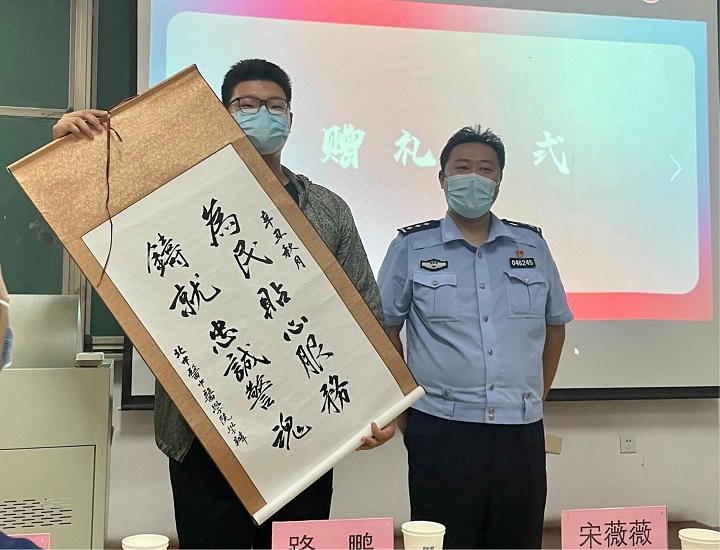 讲座伊始,国产麻豆 学生分别向拱辰派出所警官和保卫处老师赠送礼物——学生亲笔书写的书法作品,内容是“为民贴心服务 铸就忠诚警魂”和“守校园净土 护师生平安”。