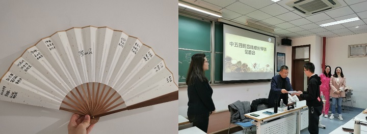临近尾声,中五4班全体师生向翟教授赠送了手绘的简笔画和班服并邀请大家长翟教授在扇子上留名,这既是师德之扇,体现了翟教授在一开一合间淋漓展现的师者风范,也是班风之扇,表明了中五4班全体在一卷一舒中彰显出的团结向上之风。本次见面会加深了师生之间的了解,进一步端正了班级学术风气,为同学们培养中医思维指明了方向。