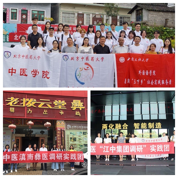 “贵农医情,一路黔行” 实践团:8月22日-30日,实践团赴贵阳、兴义开展了医疗卫生服务,“医疗兜底,精准扶贫”调研活动,向村民们进行中医药文化的宣传,走访了药店和黔西南州中医医院,参观了贵州苗药药业有限公司,还进行了爱心捐献;“滇南彝医”实践团: 8月1日-5日,实践团前往云南昆明和楚雄开展调研。参观了云南省民族医药博物馆、陆军讲武堂、抗战胜利堂、福林堂、云南白药产业园、楚雄州医院、云南省彝医医院和老拨云堂彝医馆;“首都中医药非遗调研”实践团: 7月18日-22日,走进北京有代表性的国家级、市区级中医药非遗项目,包括鹤年堂中医药养生文化、小罗山任氏祖传中医正骨、程氏针灸、清华池修治脚病技艺、同仁堂中医药文化,了解其历史渊源与传承方式。采访其非遗项目传承人,就非遗申请过程和困难、申遗成功之后所带来的变化和影响就行访谈;“舌尖上的中药”实践团:该实践团走进社区,为居民带来一系列的中医药知识的讲座。通过线上问卷调查,研究居民对中药的了解程度及需求,对讲座的内容进行了精准定位;“藏羚羊精准扶贫队”实践团:本次实践主要分为两部分:一是组织扶贫队队员考察当地的农业生产和中药材种植情况。二是对互助县中医院、乡村卫生所实地考察;“北中医走近‘非遗’文化传承”实践团:7月21日-23日,实践团开启了前往河南省驻马店市毛氏济世堂的征程。实践团成员与国家级非物质文化遗产“脱骨疽疗法”传承人毛顺卿老先生进行了深入交谈;“江中集团调研”实践团:7月24日-29日前往江西南昌开展以“‘文化传承’社会主义先进文化倡导宣讲活动”为主题的暑期社会实践。该团前往江中集团参观学习,前往东华理工大学质谱科学与仪器江西省重点实验室;“非遗传承小分队”实践团:8月2日-9日,该团成员在指导老师刘亚品的带领下进行了为期一周的以“燕青门”为例的传统医药类非物质文化遗产保护管理机制探索及青年中医对其的传承传播初探暑期社会实践活动。