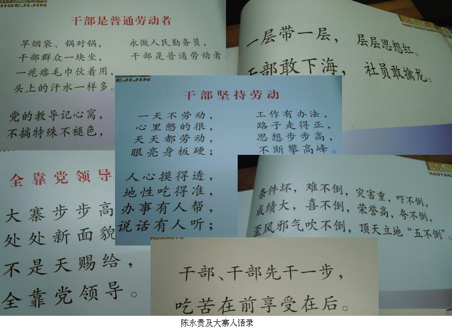 在参观过程中,我们感叹大寨精神代表了中国农民自强不息的精神,而这种精神在改革开放和新形势飞速发展的今天,依然持续焕发着青春和活力,并且值得我们每个同志在工作学习和日常生活中很好地学习与借鉴。我们也深深的体会到大寨人语录“干部带了头,群众有劲头。干群一条心,生产争上游”“联系群众,心明眼亮。不摔跟头,不打败仗”的含义。大家纷纷表示,要以陈永贵、郭凤莲等前辈为榜样,以大寨精神激励自己,带动全院师生,紧密结合本职工作,深入开展党的群众路线教育实践活动,把学院党建思想政治工作和事业发展推向新高度、新水平。